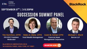 On September 8, 2025, Partner Michael Ward was a panelist at the “Succession Summit” hosted by the Financial Planning Association (FPA) of Metro New York at BlackRock’s New York office. The event focused on succession planning in the financial planning industry and how succession can be affected by different types of mergers & acquisitions.